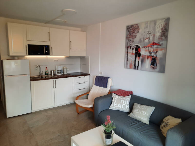 El apartamento está ubicado en el primer piso con vista al jardín tropical. Se puede llegar al apartamento tanto por escaleras como por algunos ascensores. Es un apartamento de propiedad privada totalmente amueblado y puede alojar hasta dos personas. Su apartamento tiene un dormitorio independiente con 2 x 1 pers. cómodas camas y amplio armario dormitorio con espejos, baño con amplia ducha a ras de suelo y lavadora, cocina abierta con electrodomésticos (heladera con dos puertas y congelador, placa de inducción de 3 fuegos, tostadora, microondas / grill, cafetera). Salón confortable y acogedor. El apartamento tiene un sistema estéreo (apto para CD, iPod, iPhone, USB), Samsung Smart TV.